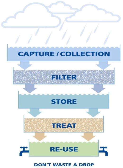 Rury spustowe kierują wodę do zbiornika. Do oddzielenia pierwszych zanieczyszczonych litrów (tzw. system „pierwszego spłukiwania”) często stosuje się specjalne filtry lub rozdzielacze.