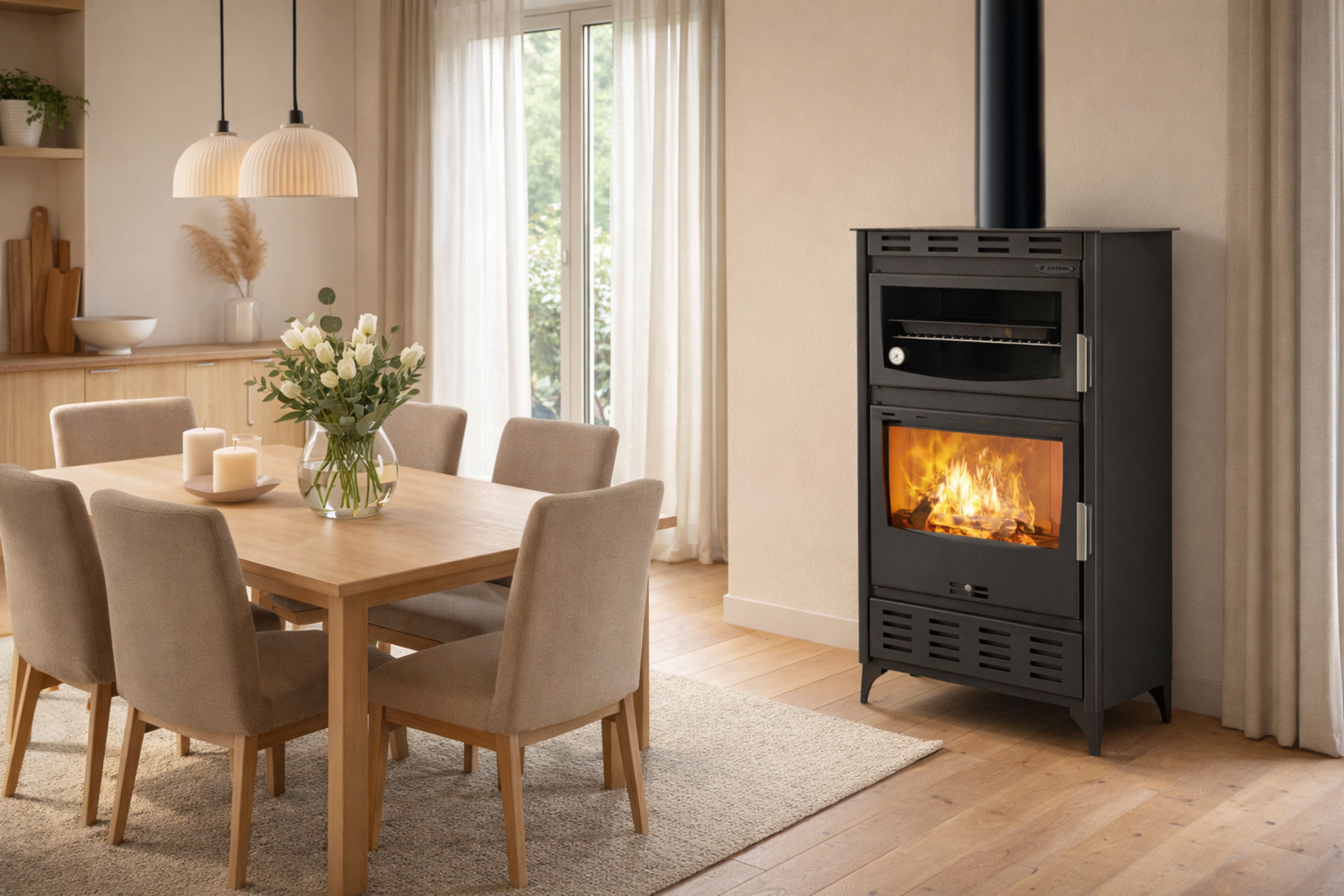 - Regulowany dopływ powietrza – kontrola procesu spalania i intensywności ogrzewania.